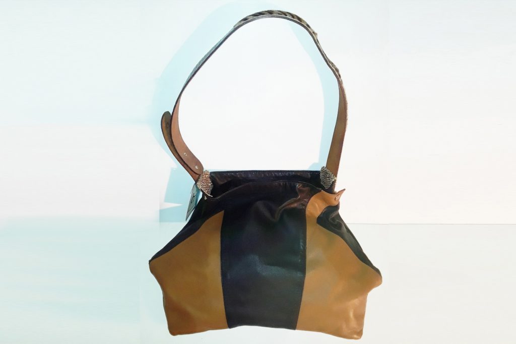 Sac en cuir vachette souple, noir et beige. Anse ajustable en cuir brun décoré style galuchat.Doublure de tissu et poche intérieure en cuir.